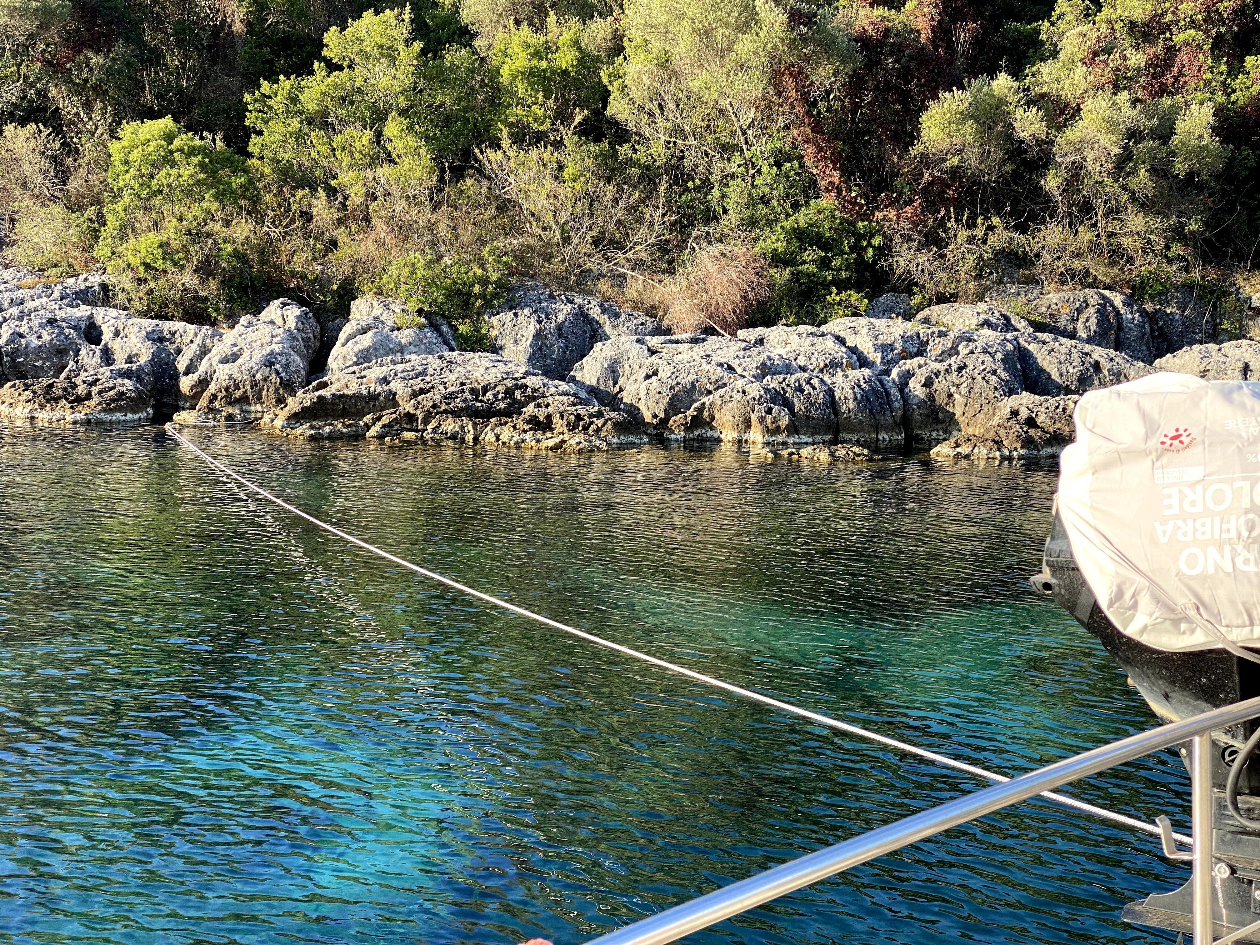 We are heading to Kefalonia to meet Victoria’s daughter Danae and her friends in 2 days, so we stop in a bay in Meganisi island. The bay we pick is deep and narrow and has 6 or so boats there already all Med-moored with lines to shore, so we need to do the same (not enough room to anchor in the middle).