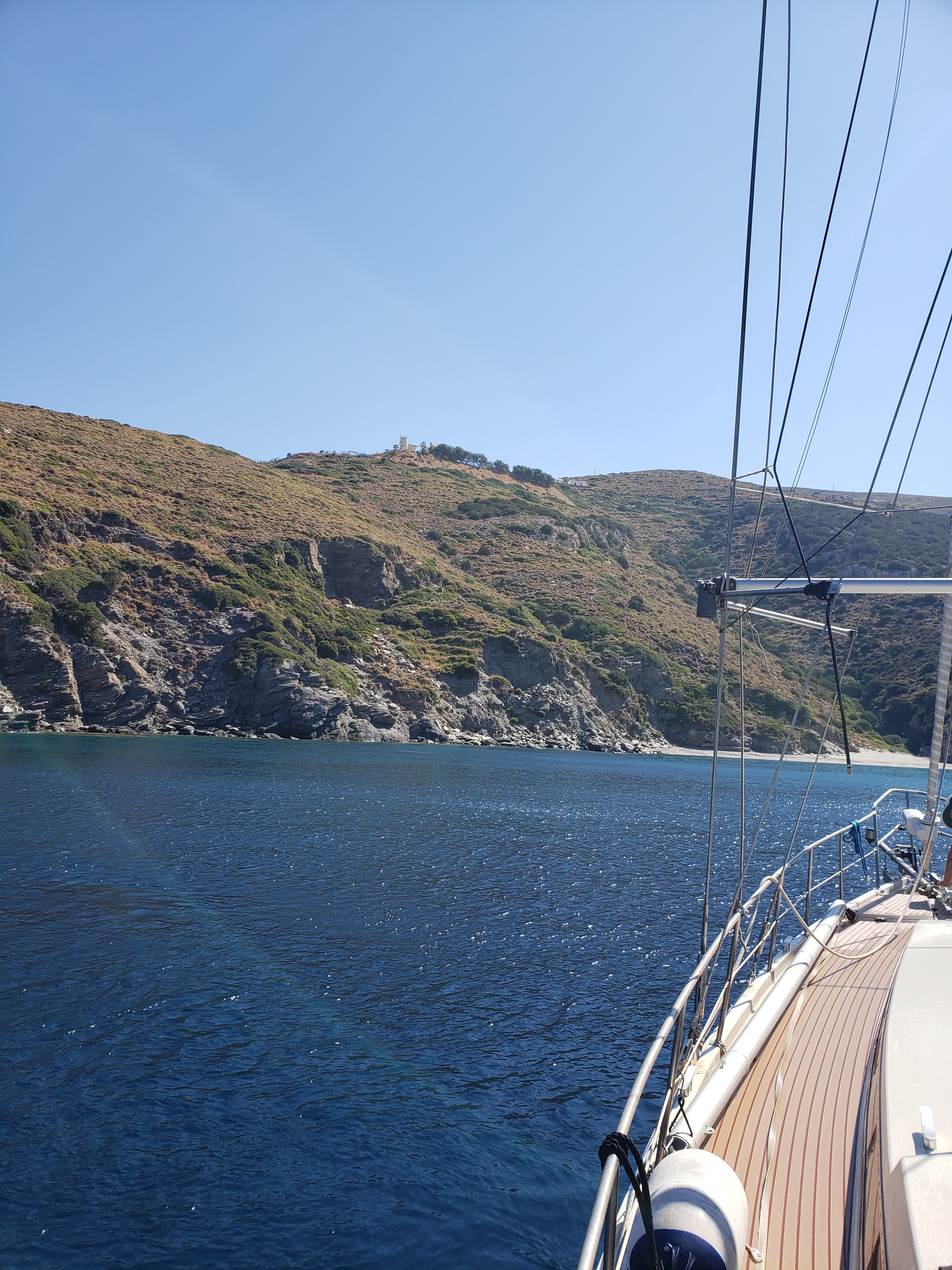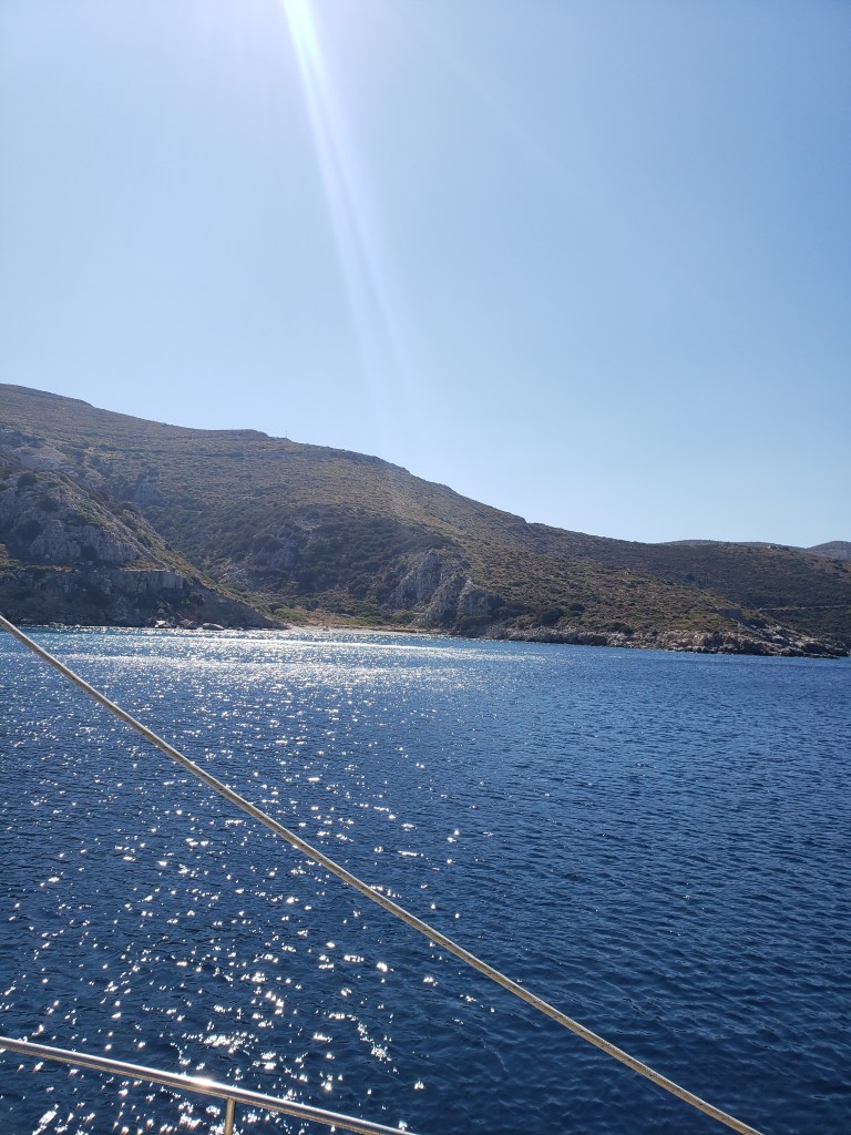 It’s an absolute blessing to have a captain that keeps his cool in distress. It makes it seem not only possible, but even probable, to survive the storm. Which we did! At around 6 am the winds went down to 27 knots (!!!) and the sea seemed calmer, at least no white mist was visible. So we raised anchor and started travelling towards Fourni. We only needed to do 25 nm and it seemed doable! About half way to our destination, the wind had dropped to 8 or 9 knots but the waves were following the surreal pattern of a huge invisible storm! Waves were coming from all directions and seemed they were becoming bigger and bigger! The boat was having the starboard side rails in the water and immediately the port side was in the water next. We could see the islands of Fourni right in front of us and we couldn’t get there soon enough. I felt exhausted and by now I had settled in the habit of crossing myself every five seconds as it seemed that it worked since we were still breathing…