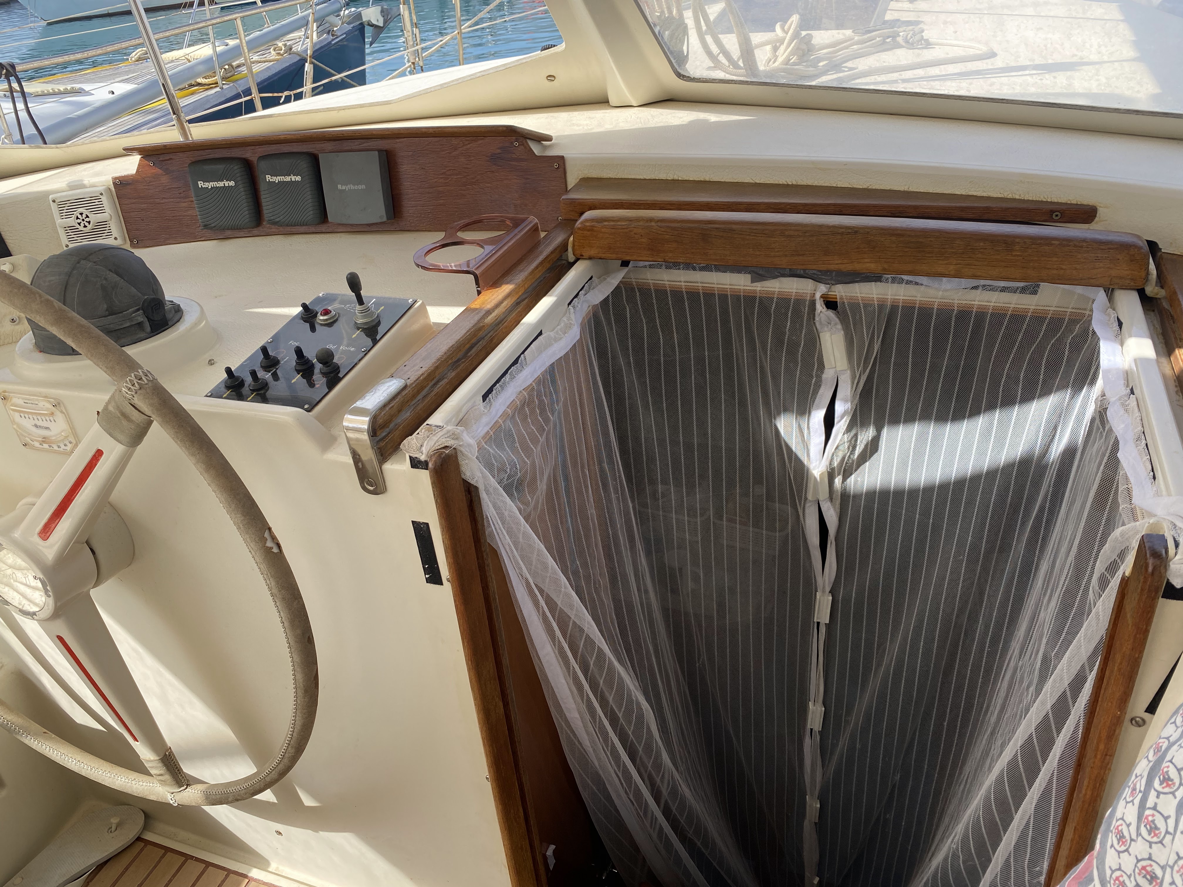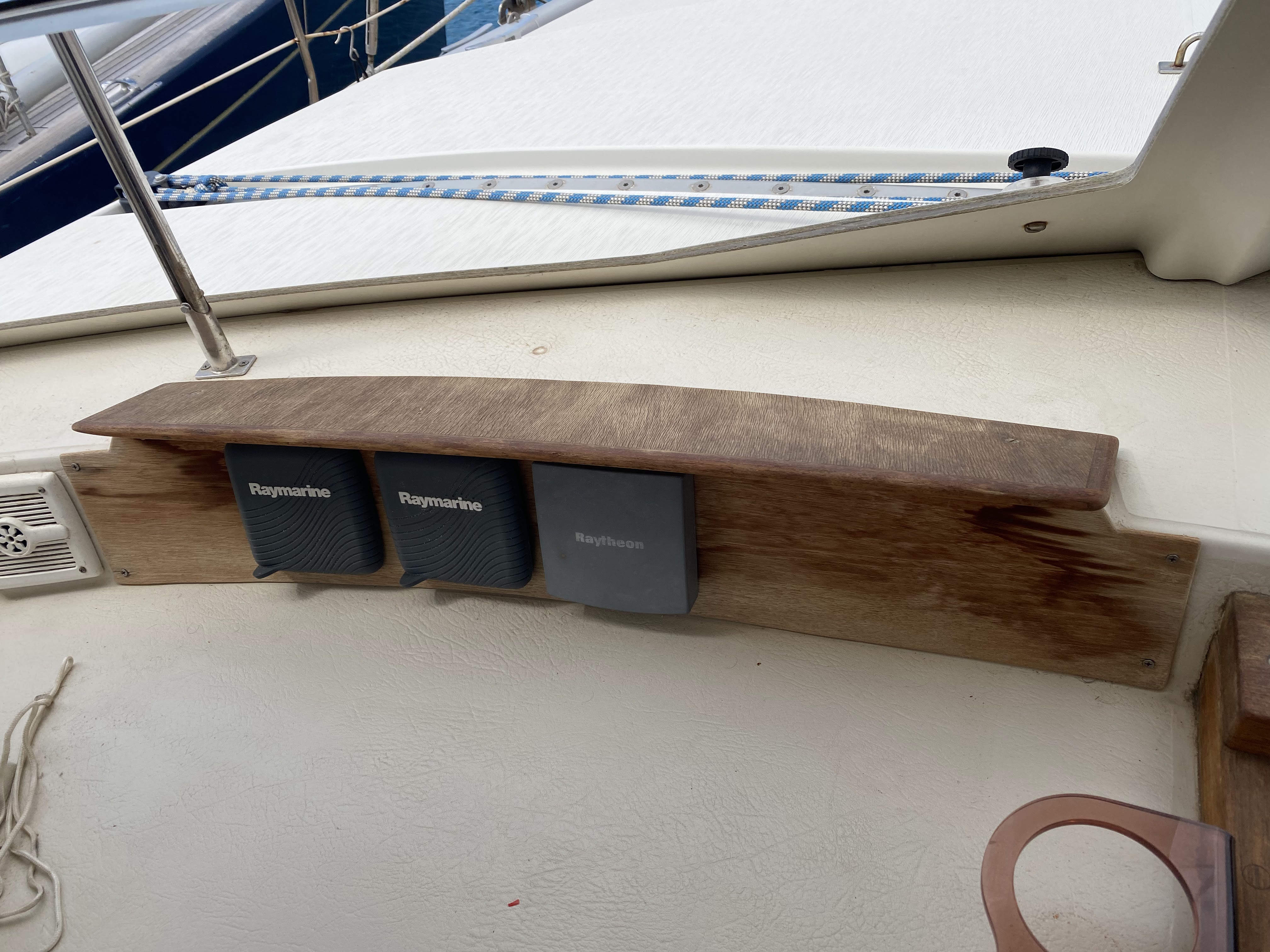 The first thing I did was to finish the wood trim we have in our cockpit that was looking old. The finish had mostly worn off, and the wood was no longer protected. Here is a before picture: