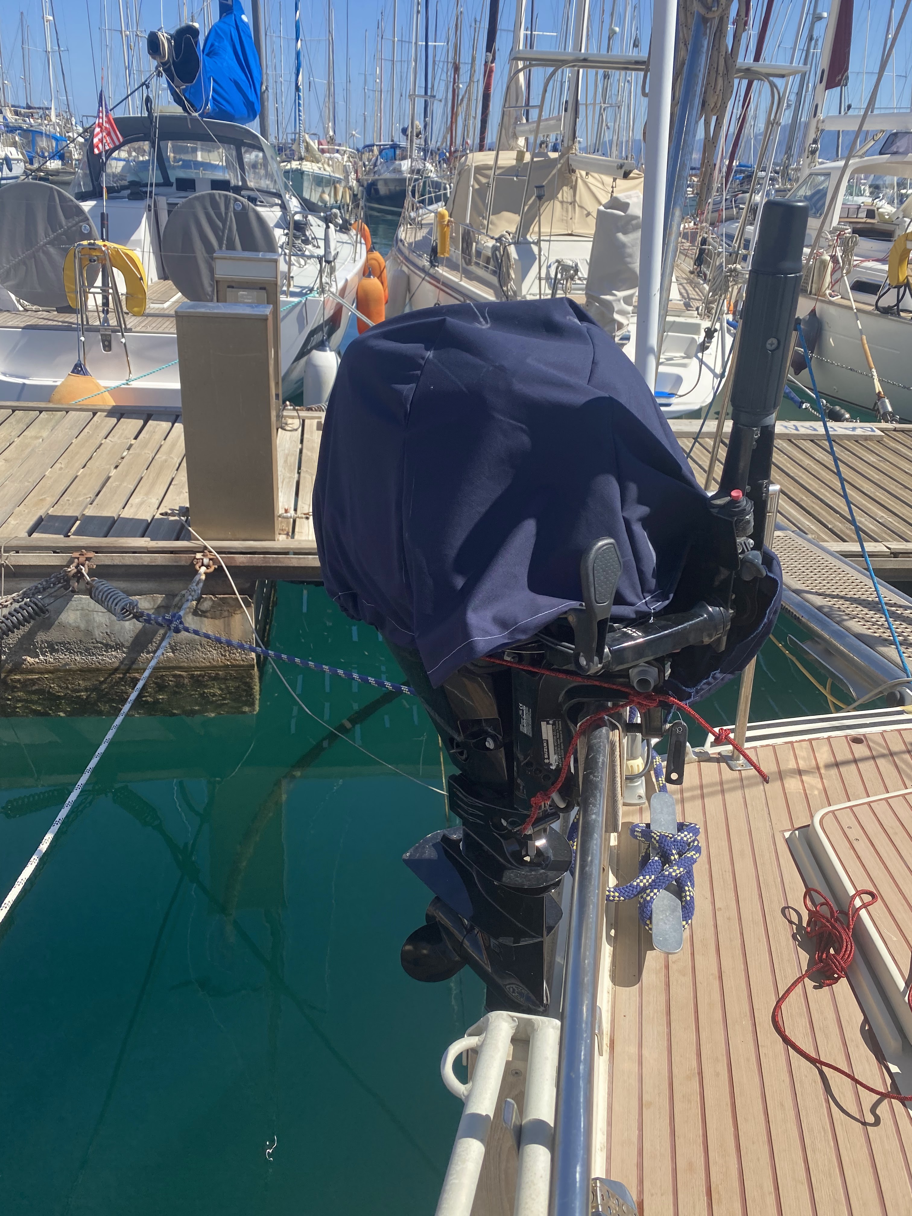 The next thing I did was make a ‘test’ outboard engine cover. We have a sewing machine, and I ordered some expensive Sunbrella fabric (UV resistant and the best material for outside) but before I cut up the $80/yard stuff I wanted to do a test piece. I went to a local fabric store, and of course I was ripped off by a very nice old lady who saw the financial opportunity of a clueless male in her store. Anyway I knew I was being ripped off, but I figured she needed the 20 euros more than I did, and I needed 2 yards of her cheapest fabric which didn’t seem very cheap to me. I took it back to the boat, followed a YouTube video that tells you exactly how to make an outboard cover complete with a draw-string, and off I went! (I’ve discovered there is a how-to video on YouTube for anything.)