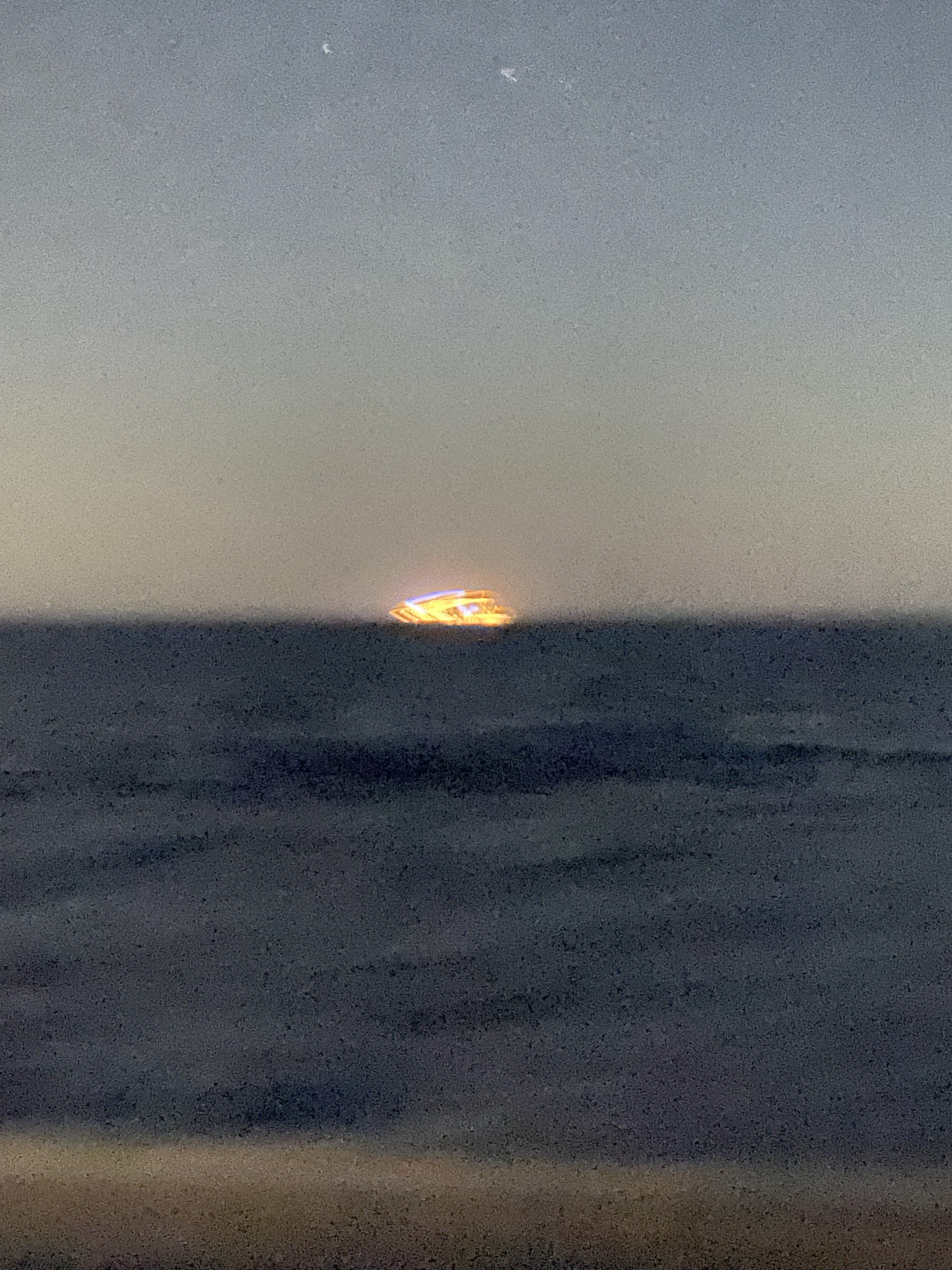 Around midnight I was on a ‘close to collision ‘approach with a large boat that looked like a ferry….it was *really* lit up….but it was weird because it was only moving 15 kts.