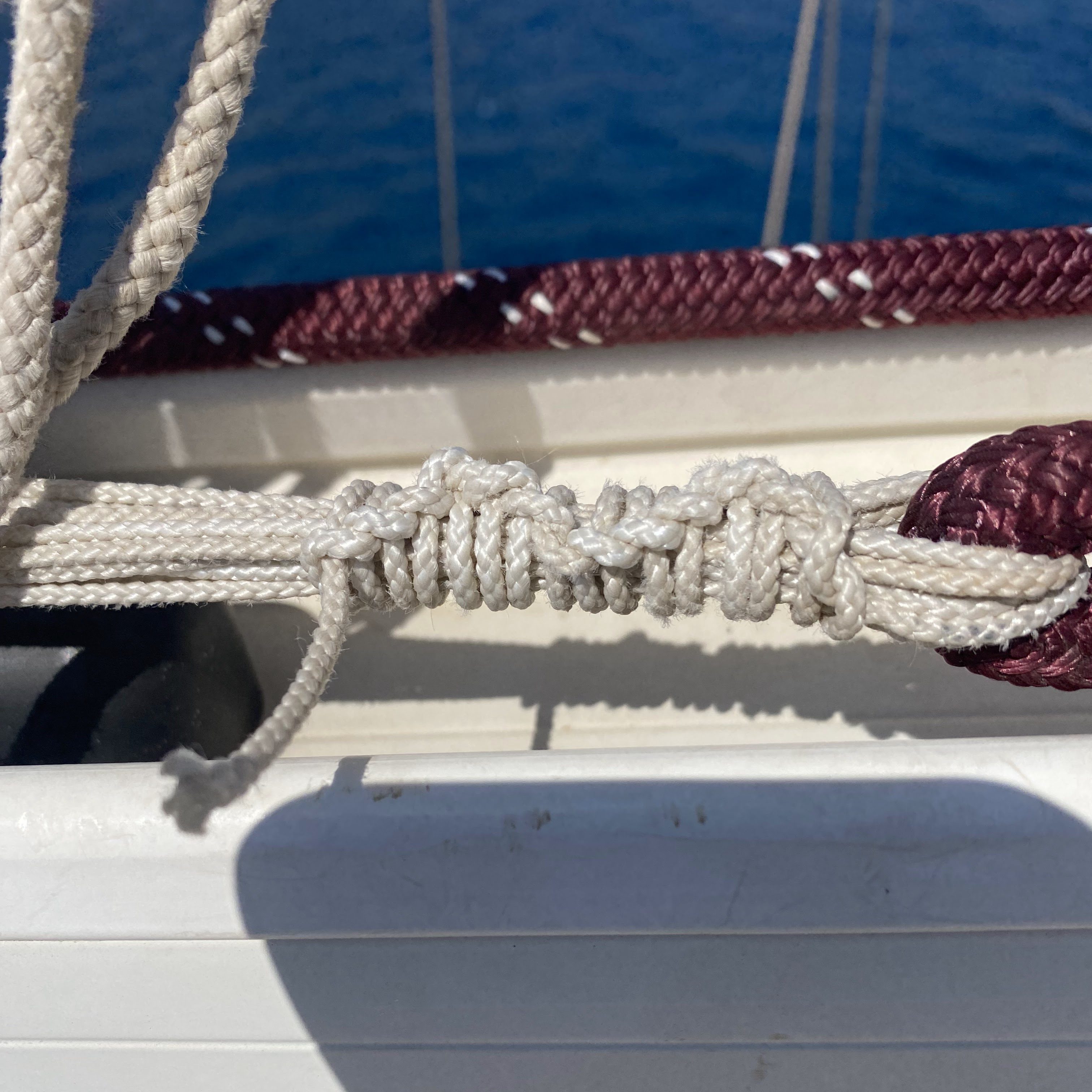 The watermaker is now fine. The generator is starting easily (helped by a battery booster). I also had to tighten the sail outhaul. Here is a picture of how I connected the lines: