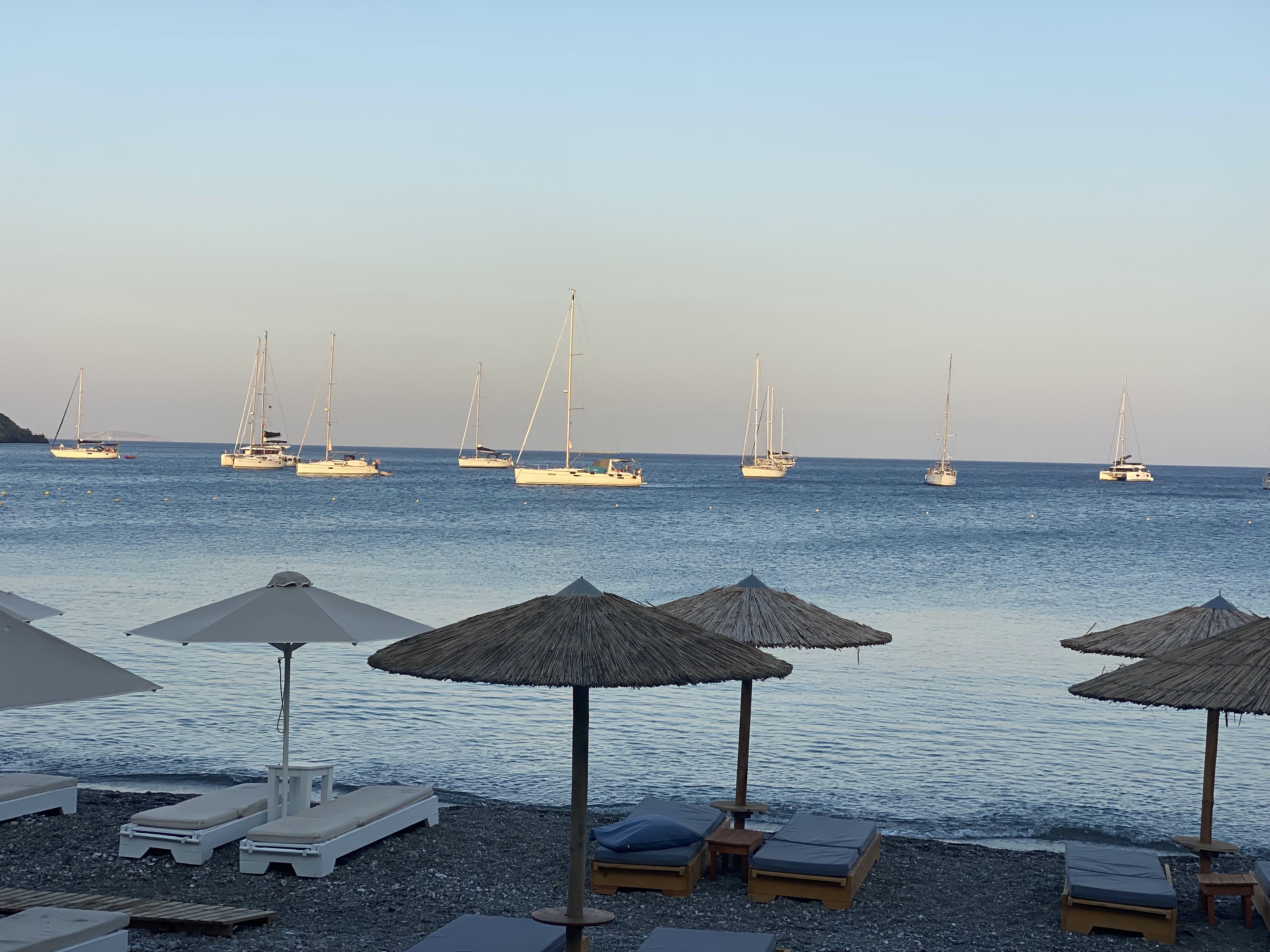 We have now settled into our routine of getting up, me making espresso for both of us, swimming, showering on deck, playing chess online, napping, and more swimming. I usually swim to check the anchor every morning (not really necessary but an excuse to swim). The water is crystal clear with 20+m visibility. and 27 degrees which you might think is warm but it is about 2 degrees colder than in Crete! I noticed the difference the first time I dove in! I religiously watch the sunset every night with a beverage. My favorite part of the day. The changing light of sunset makes everything more beautiful.